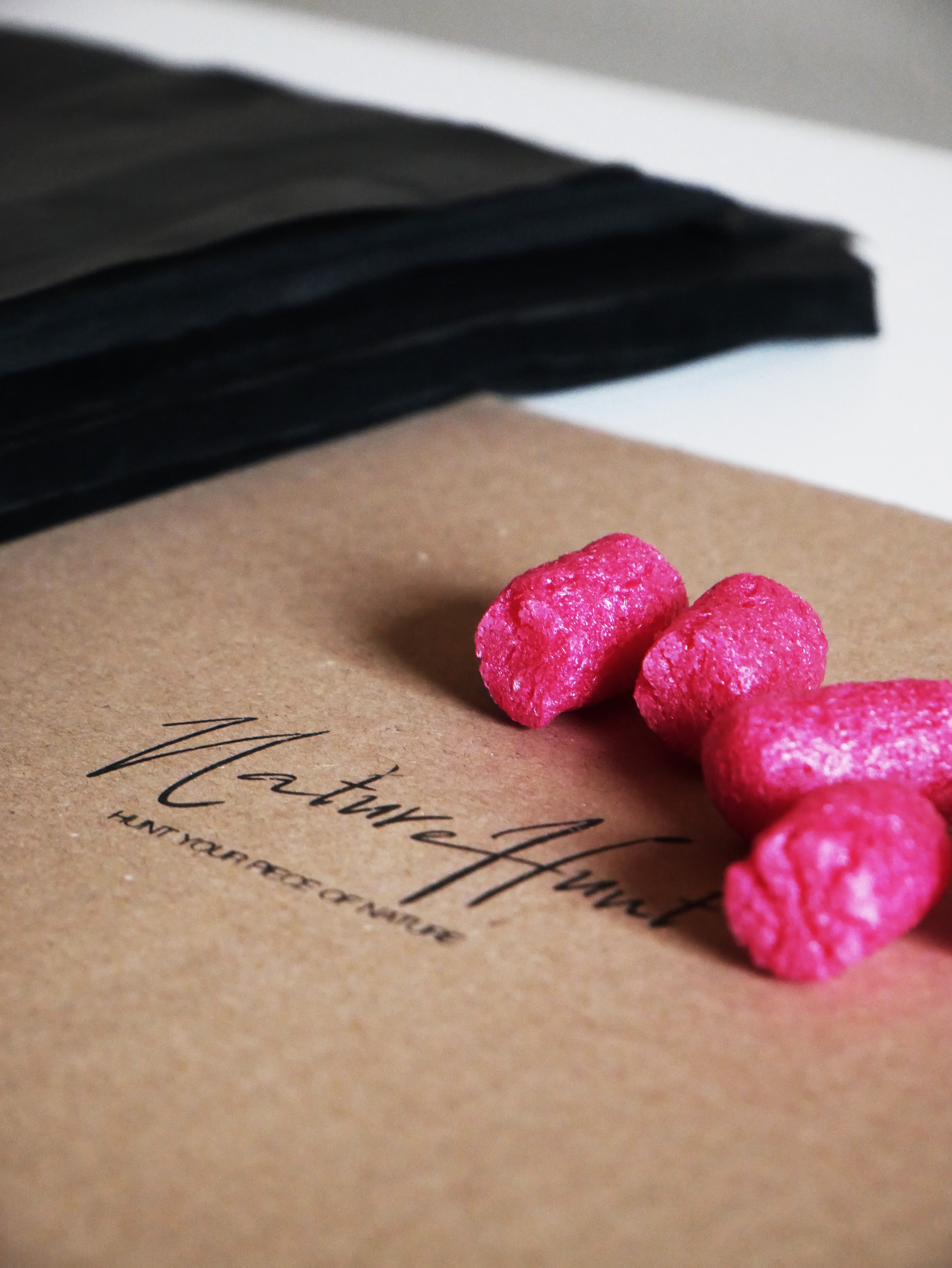 Für den Versand verwenden wir ausschließlich Papier und Wellpappe. Für einen absolut kunststofffreien Druck, stempeln wir alle Kartons und Tüten selbst und schreiben auch alle Karten per Hand.